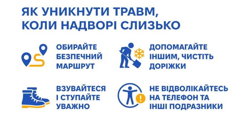 Узимку під ногами слизько за різної погоди, й росте ризик сезонного травматизму. З морозом з’являється ожеледь, з відлигою — підступна сльота. Коли світловий день короткий, а на освітлених зазвичай місцях ліхтарі не працюють через відключення електроенергії, дивитися, куди ступаєш, стає ще складніше. Усе це значно збільшує ризик послизнутися, впасти, травмуватися, тим паче якщо ще й взуття не по погоді.